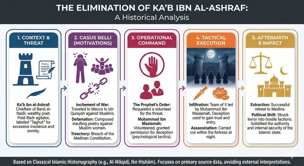The assassination of Ka'b ibn al-Ashraf was a pivotal "special operation" in Islamic history. It neutralized a significant existential threat who was actively mobilizing enemy forces against Medina. The operation demonstrated the use of intelligence, psychological warfare, and the principle that security agreements (covenants) are nullified by treason.