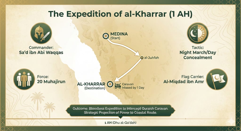 The Expedition of al-Kharrar, while bloodless, was a significant operational exercise for the early Muslim community. It established the capability of the Muhajirun to deploy small, mobile units deep into strategic territory (near al-Juhfah) and codified early military protocols such as nocturnal marching for concealment. The narratives provided by Al-Dhahabi and Ibn Kathir confirm that this event was a pivotal component of the security apparatus established by the Prophet (PBUH) in the months immediately following the Hijra.