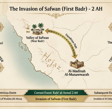 The First Expedition to Badr (Ghazwat Badr al-Ula), also commonly referred to in biographical literature as the Invasion of Safwan (Ghazwat Safwan), was a military sortie led personally by the Prophet Muhammad (peace be upon him) during the early period of the Medinan era. It is distinct from the Great Battle of Badr (Badr al-Kubra), which occurred later. Historians such as Ibn Hisham and Ibn Sayyid al-Nas explicitly categorize this event as the "First Badr" to distinguish it from the major confrontation with the Quraysh (Ibn Hisham, 1955; Ibn Sayyid al-Nas, 1993).