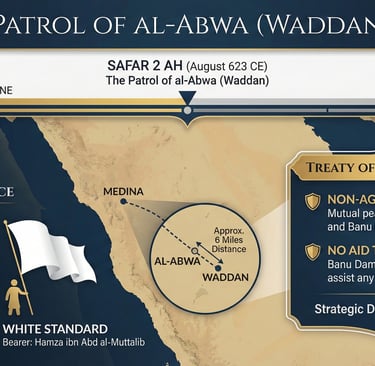 The Patrol of al-Abwa (Arabic: غزوة الأبواء), also referred to as the Patrol of Waddan (غزوة ودان), holds the distinction of being the first military campaign led personally by the Prophet Muhammad (peace be upon him). It marked a significant shift in the strategic posture of the nascent Muslim state in Medina, transitioning from passive defense to active patrolling of trade routes and alliance-building.